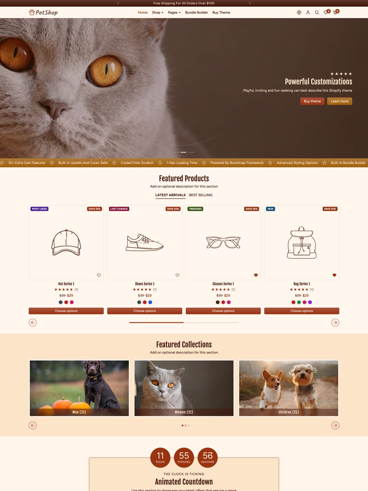 As the name suggests, KS PetShop (view the demo) is the perfect choice for Shopify stores selling pet food or any products related to dogs, cats, birds, and more. However, thanks to our proprietary color options logic, you can easily swap the default brown color scheme to match your brand’s identity. It’s as simple as adjusting a few color settings (primary, secondary, etc) in the main theme settings.